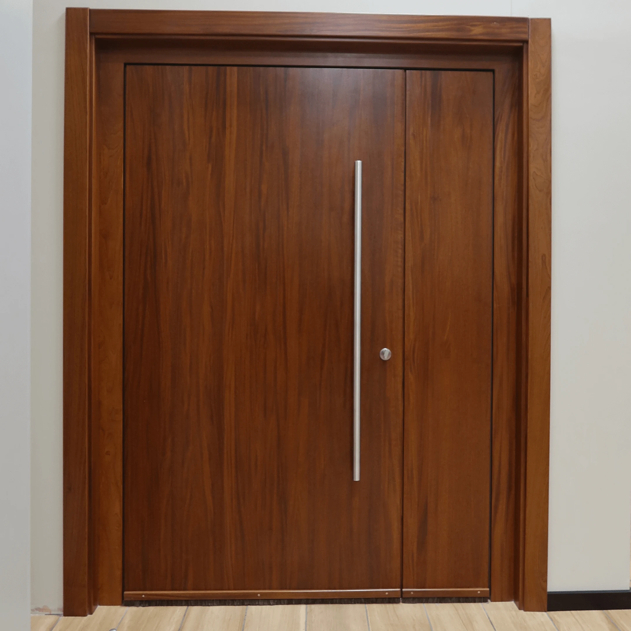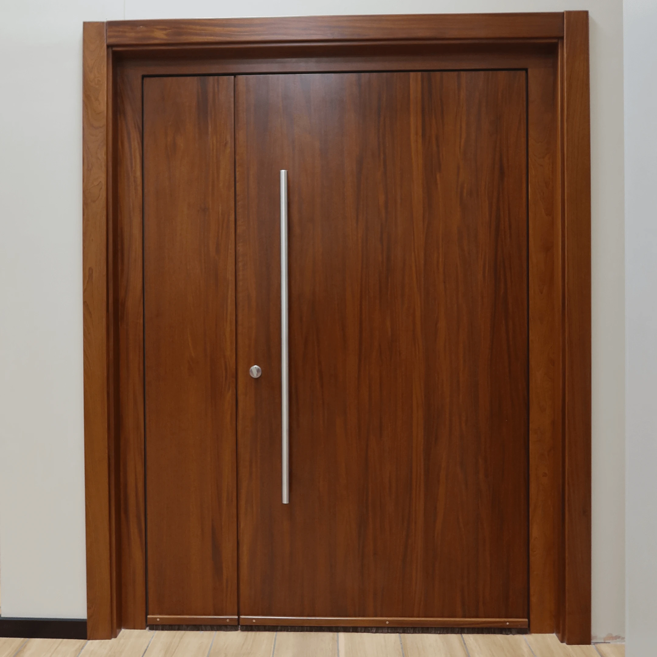 Porte d’extérieur en bois massif à double pivot avec semi-fixe. Ce modèle classique est proposé en quatre teintes laquées ou trois finitions bois.