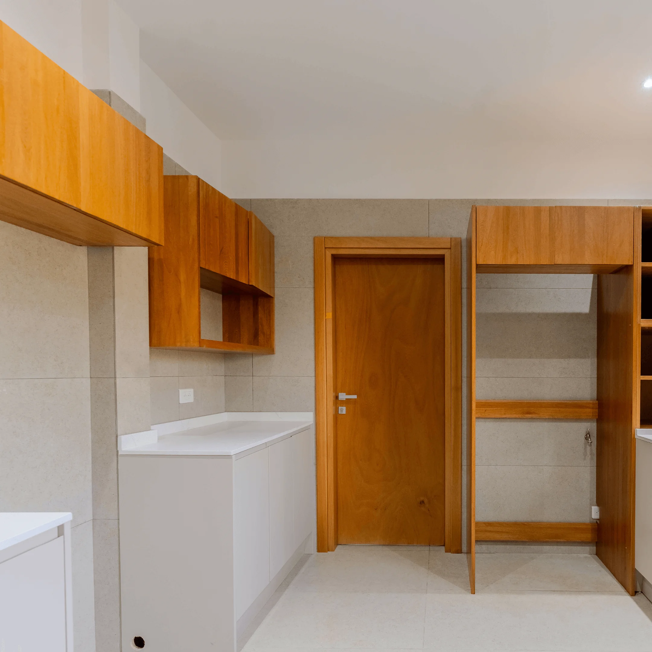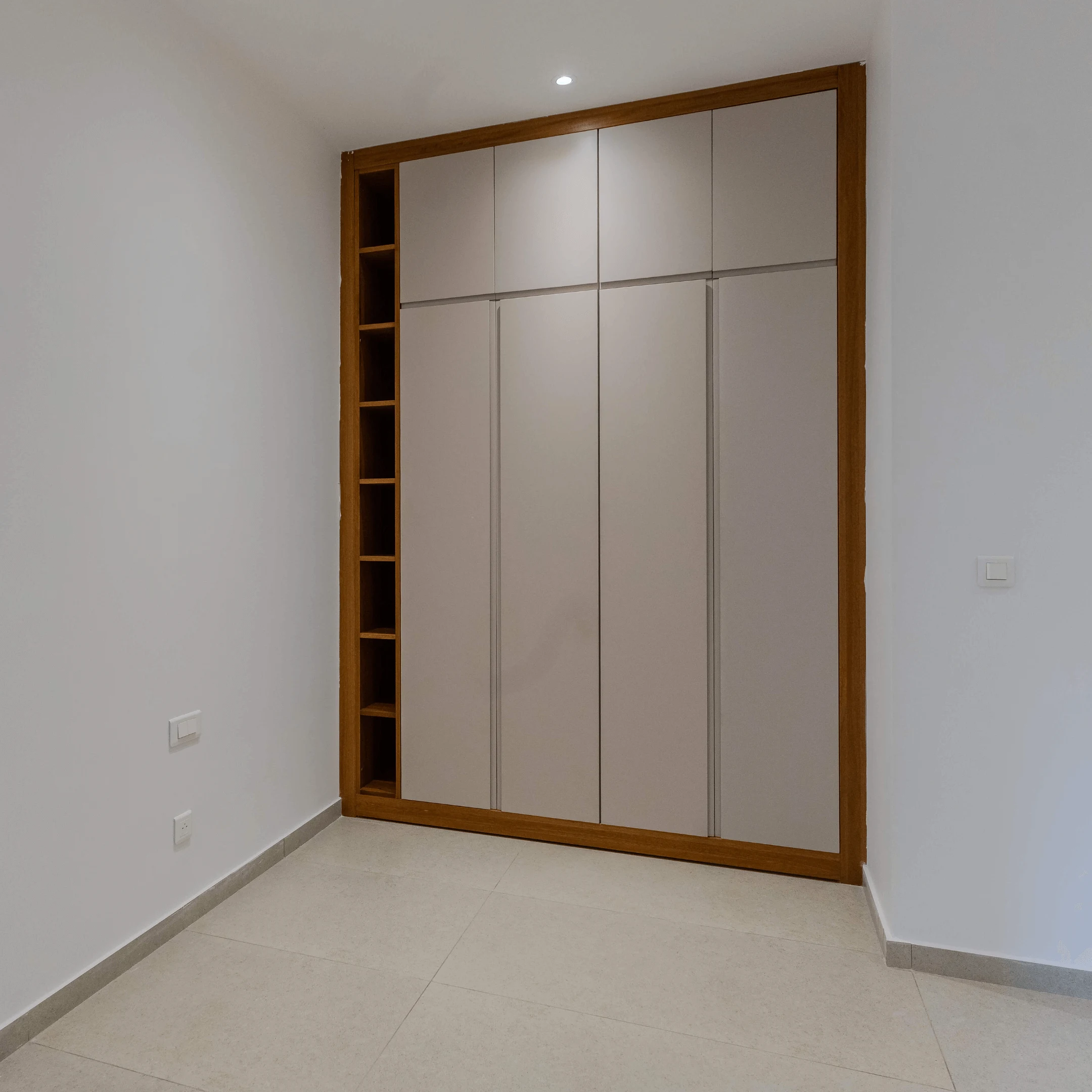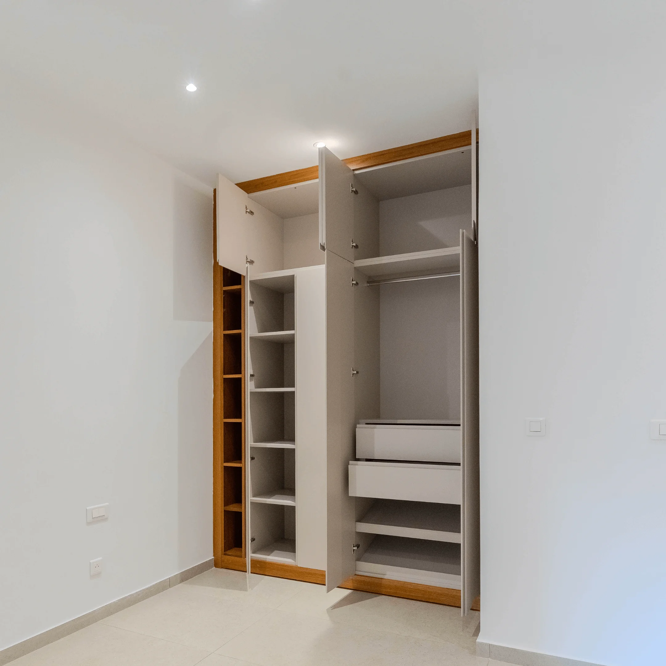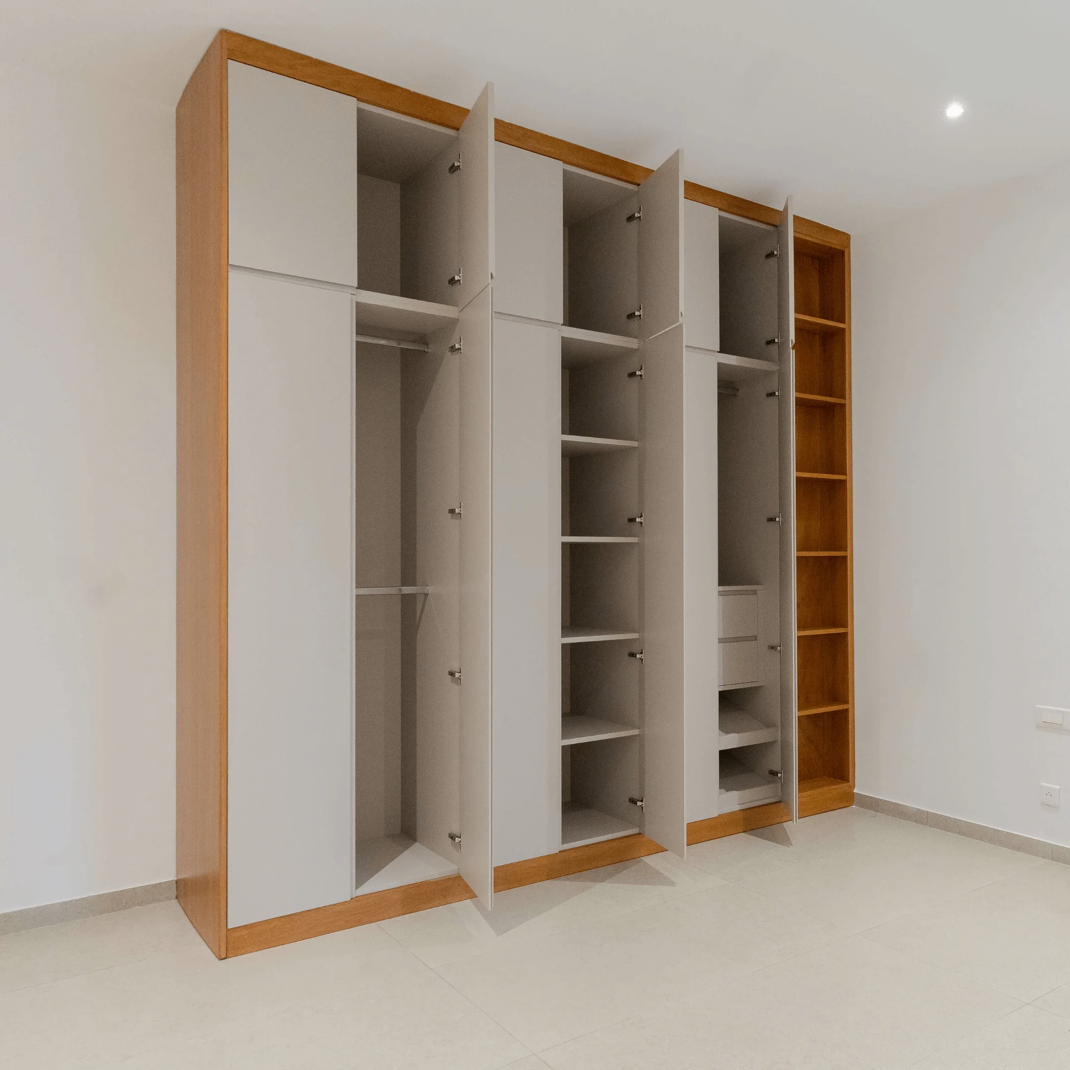 Les ouvrages ont été conçus dans une teinte noyer clair, offrant une harmonie élégante et chaleureuse à l’ensemble des espaces.