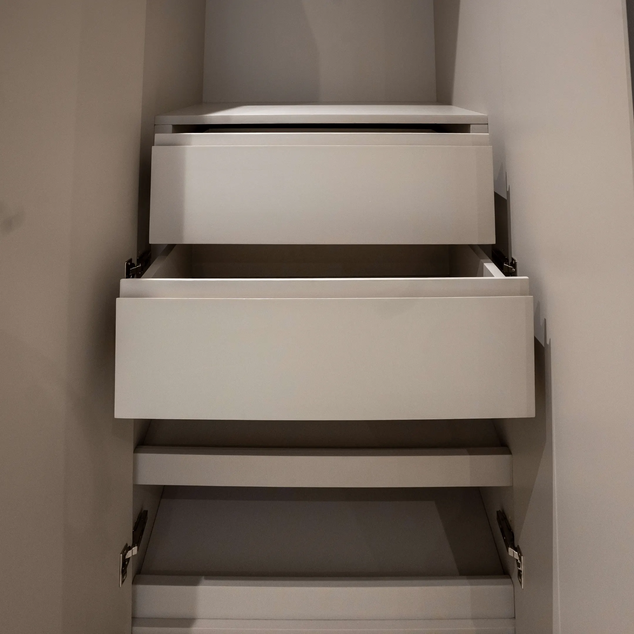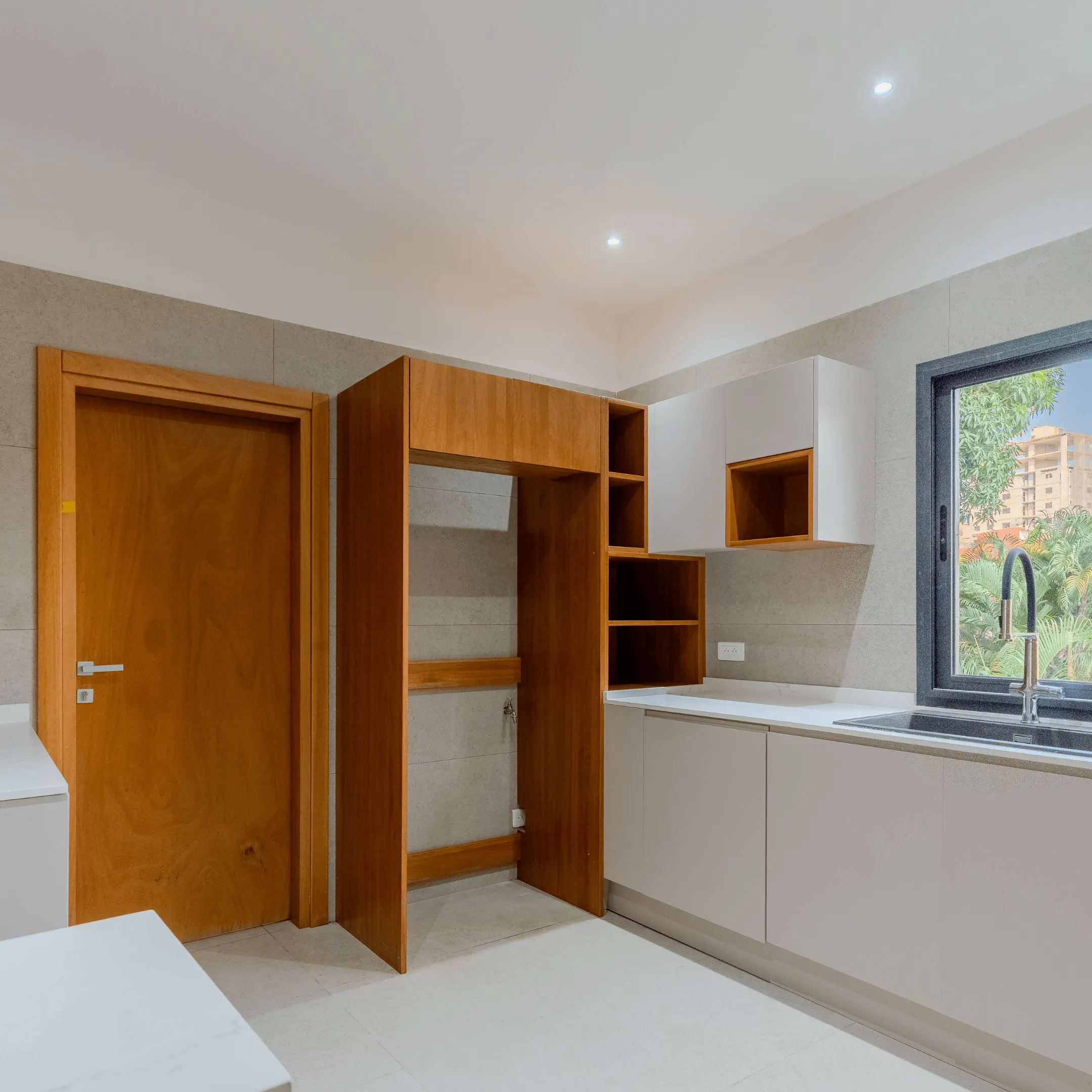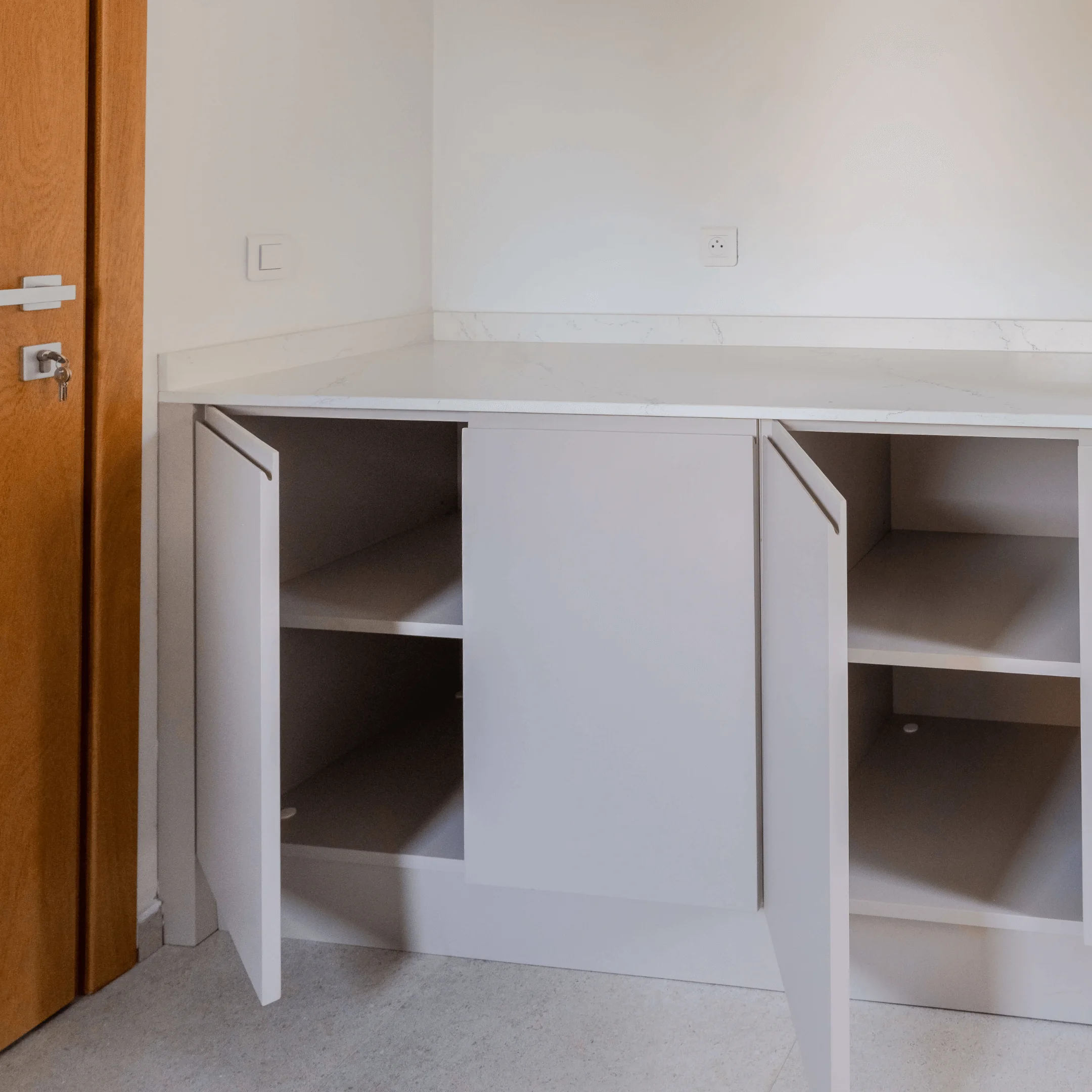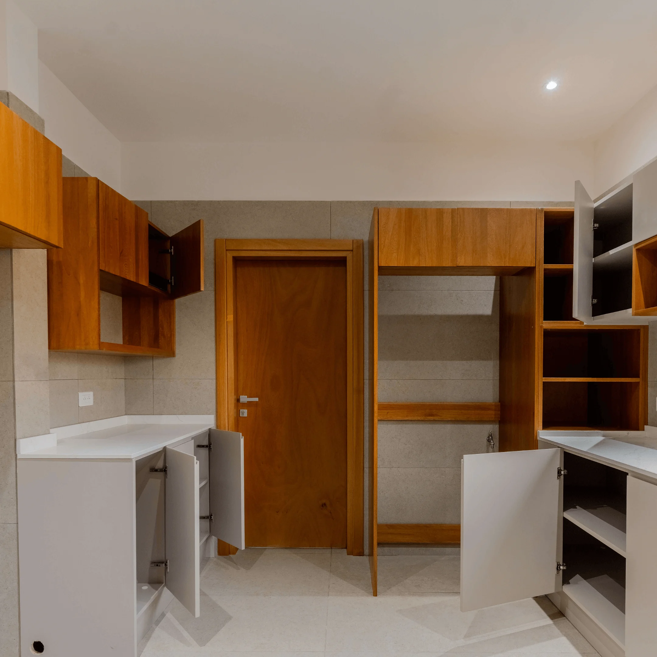 Les ouvrages ont été conçus dans une teinte noyer clair, offrant une harmonie élégante et chaleureuse à l’ensemble des espaces.