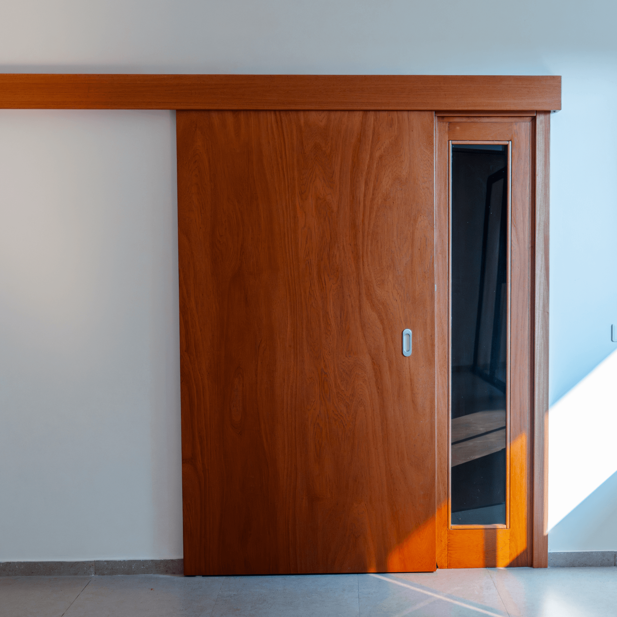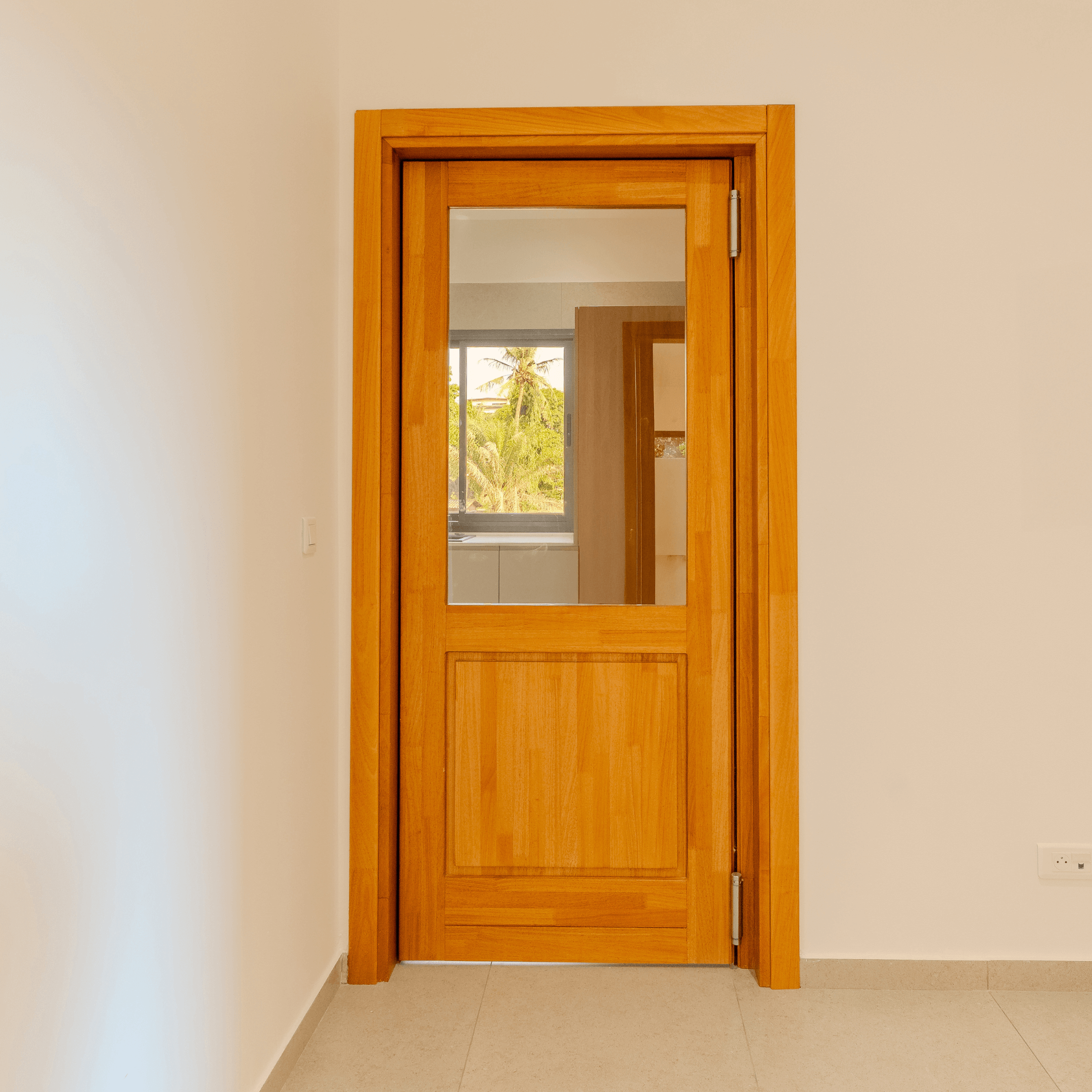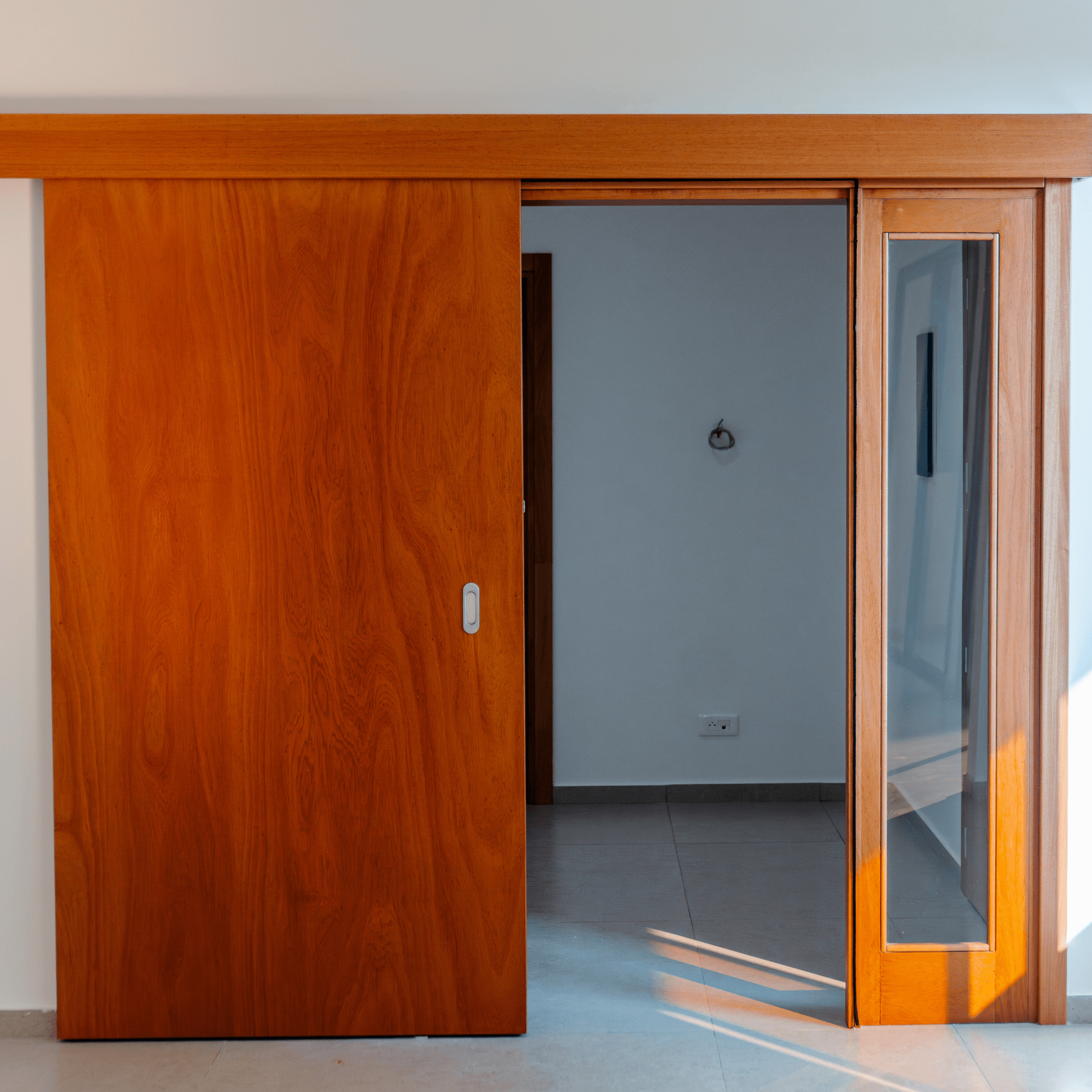 portes coulissantes, va-et-vient vitrées, et battantes, toutes assorties dans la même finition noyer clair.