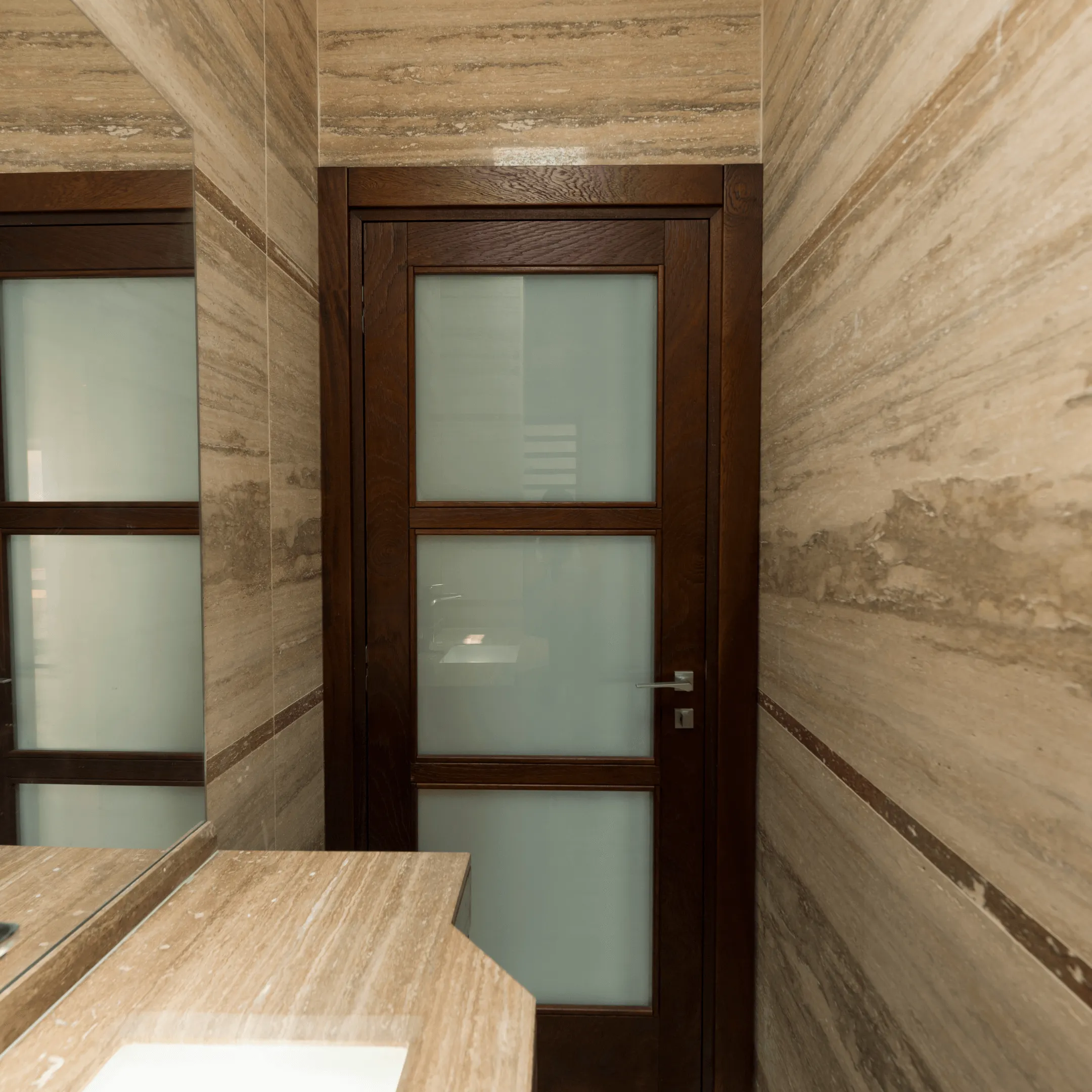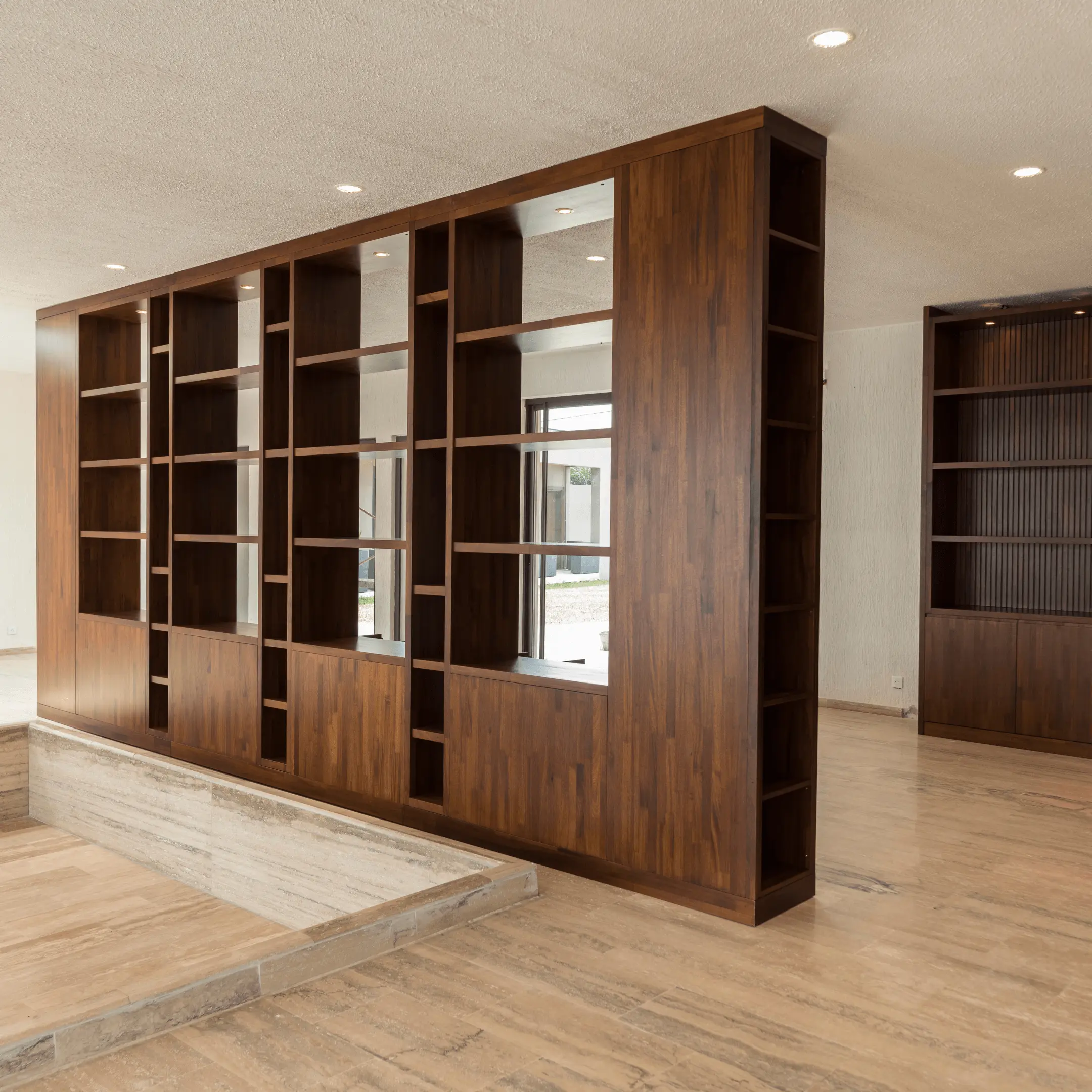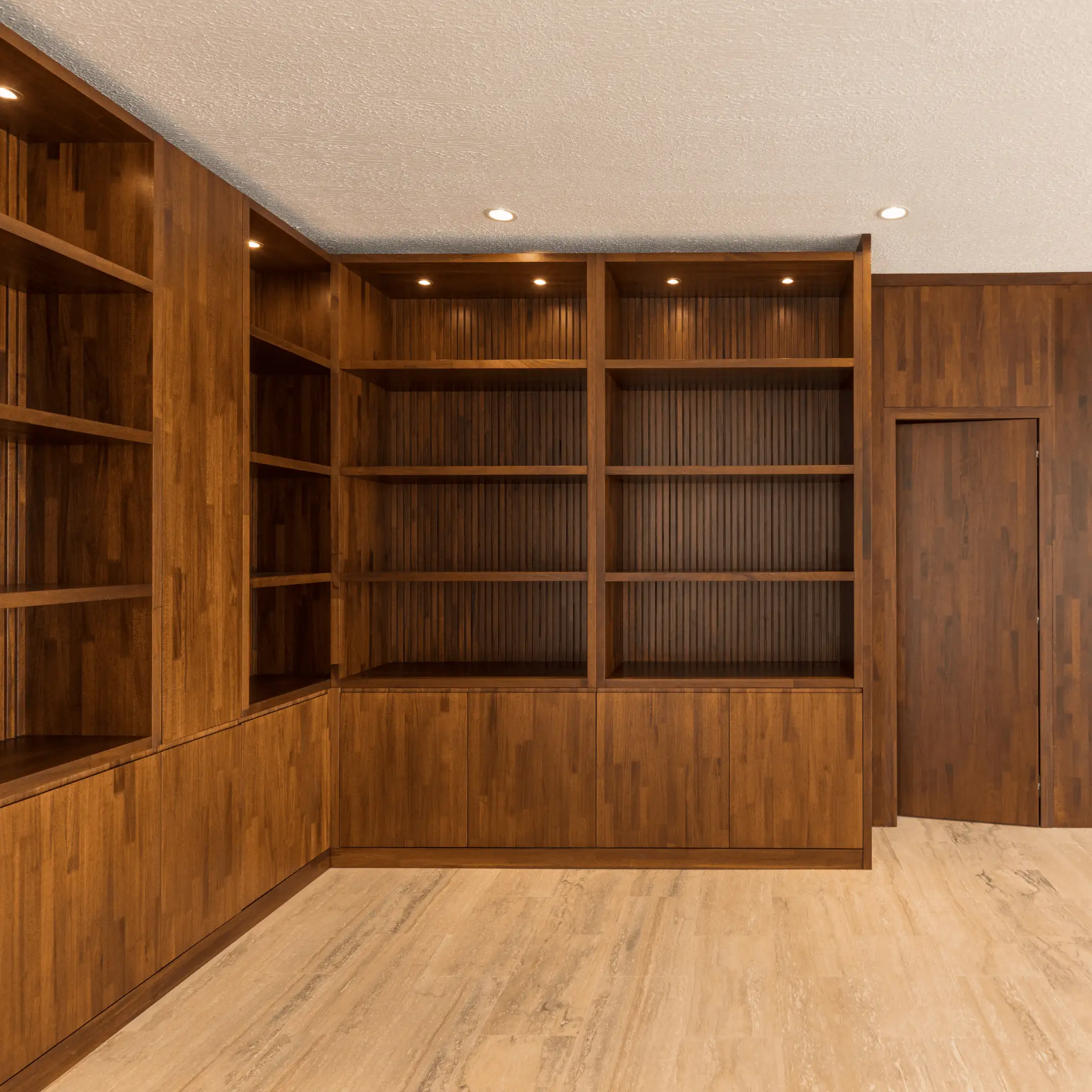 Le projet comprend une bibliothèque, des panneaux d’habillage mural intégrant une porte va-et-vient “scomparsa” (porte dissimulée), ainsi que des portes intérieures en bois massif, finition noyer, vitrées et va-et-vient.