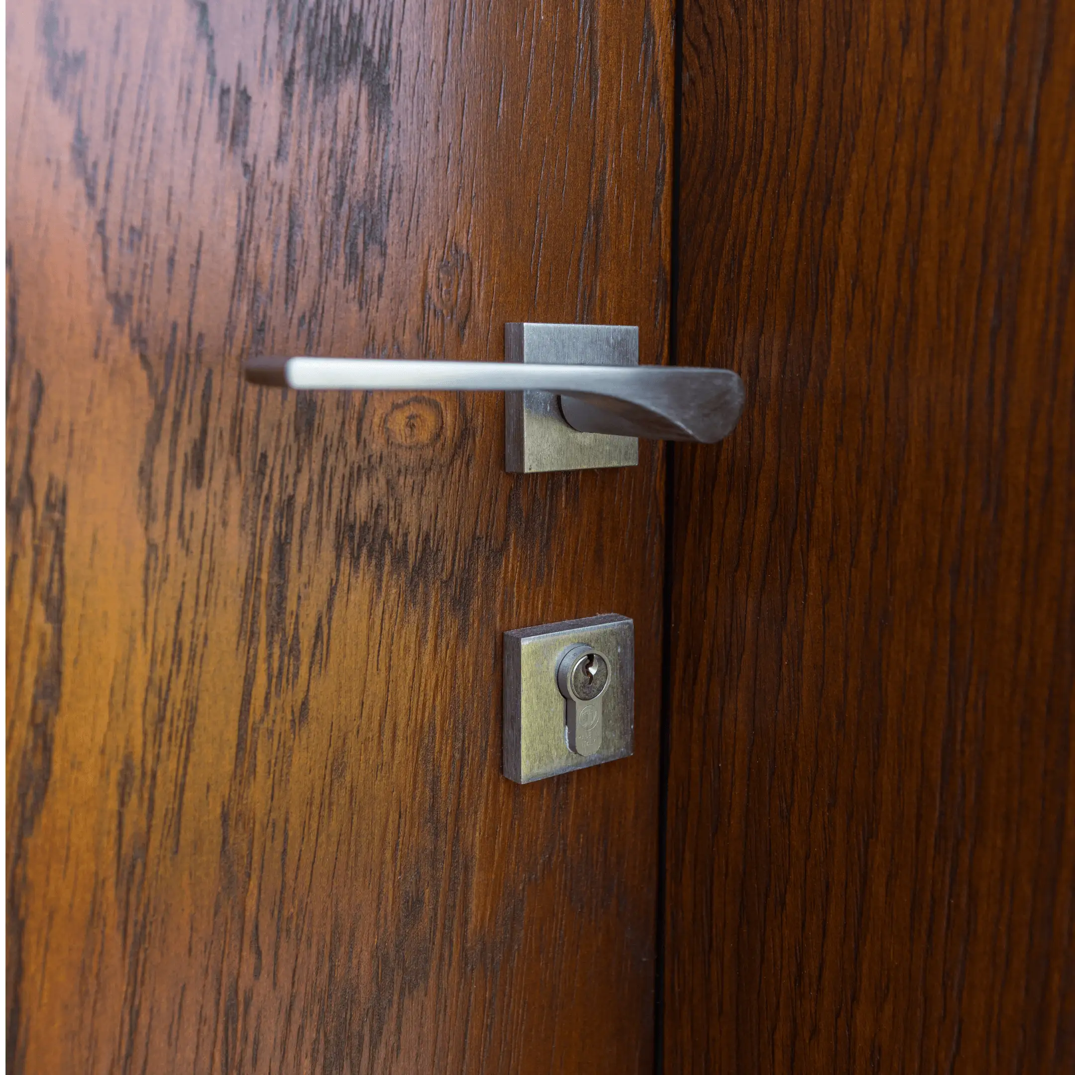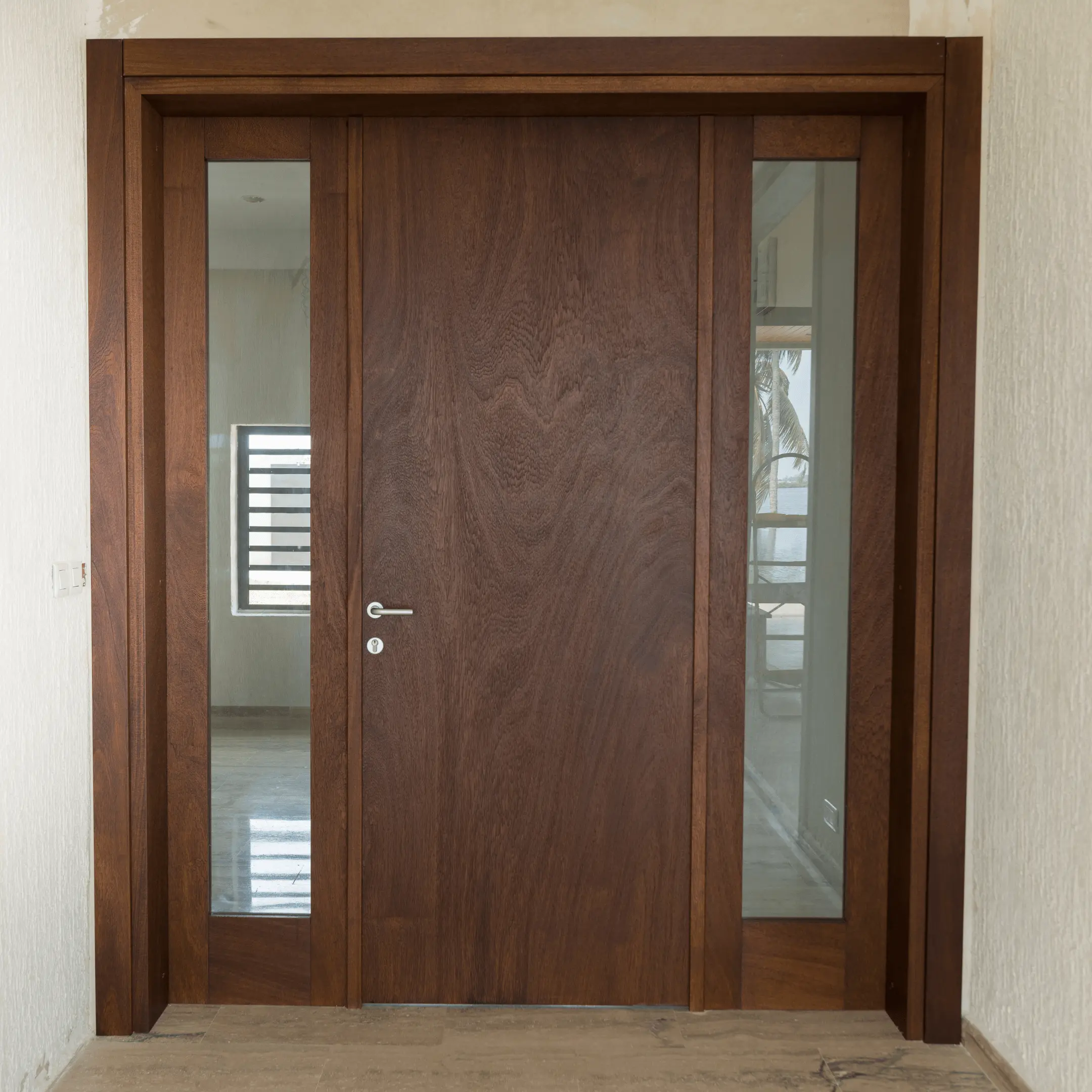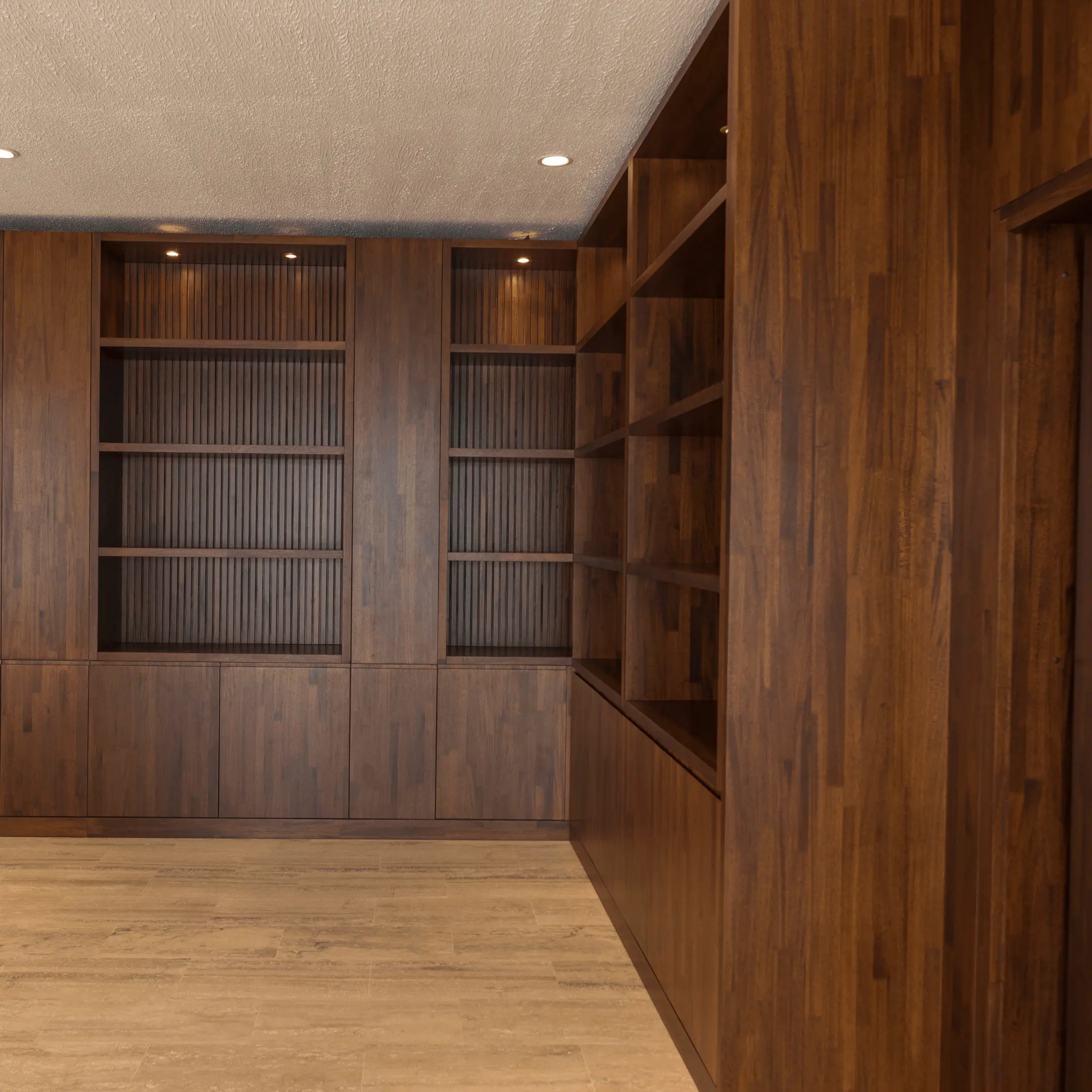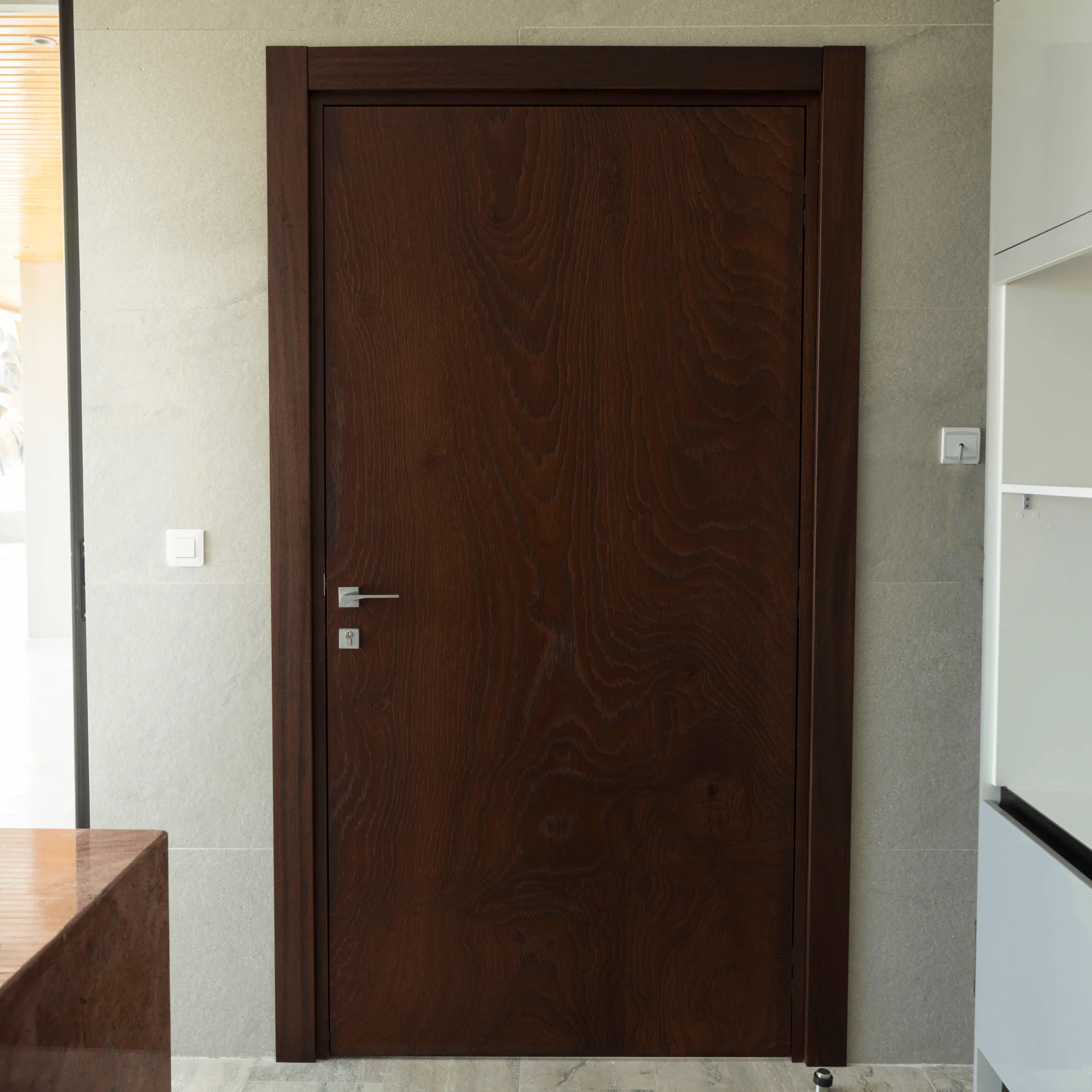 Le projet comprend une bibliothèque, des panneaux d’habillage mural intégrant une porte va-et-vient “scomparsa” (porte dissimulée), ainsi que des portes intérieures en bois massif, finition noyer, vitrées et va-et-vient.